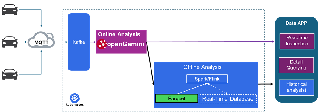 在现代车联网典型技术架构中,数据接入端采用了MQTT、Kafka等技术,显著提升了数据采集的实时性。为了进一步优化实时数据分析,引入了时序数据库,并结合了Spark、Flink等高性能大数据处理工具,使得离线分析效率得到了显著提升。整个业务架构构建在Kubernetes(K8s)之上,有效提高了计算资源的利用效率。