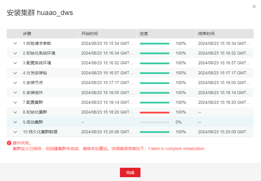 [2024-08-23 15:18:21]Initialize cluster for CLUSTER[name:huaao_dws].