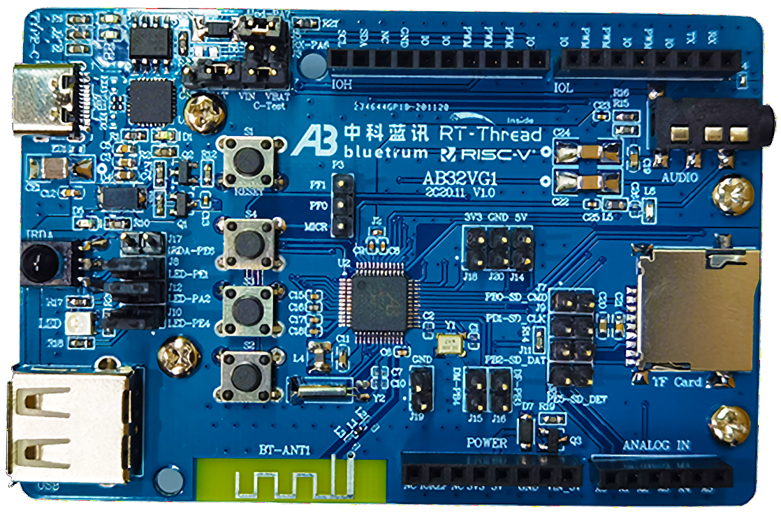 AB32VG1开发板是以中科蓝讯(Bluetrum)公司推出的基于RISC-V架构的高配置芯片AB5301A为核心所组成的。