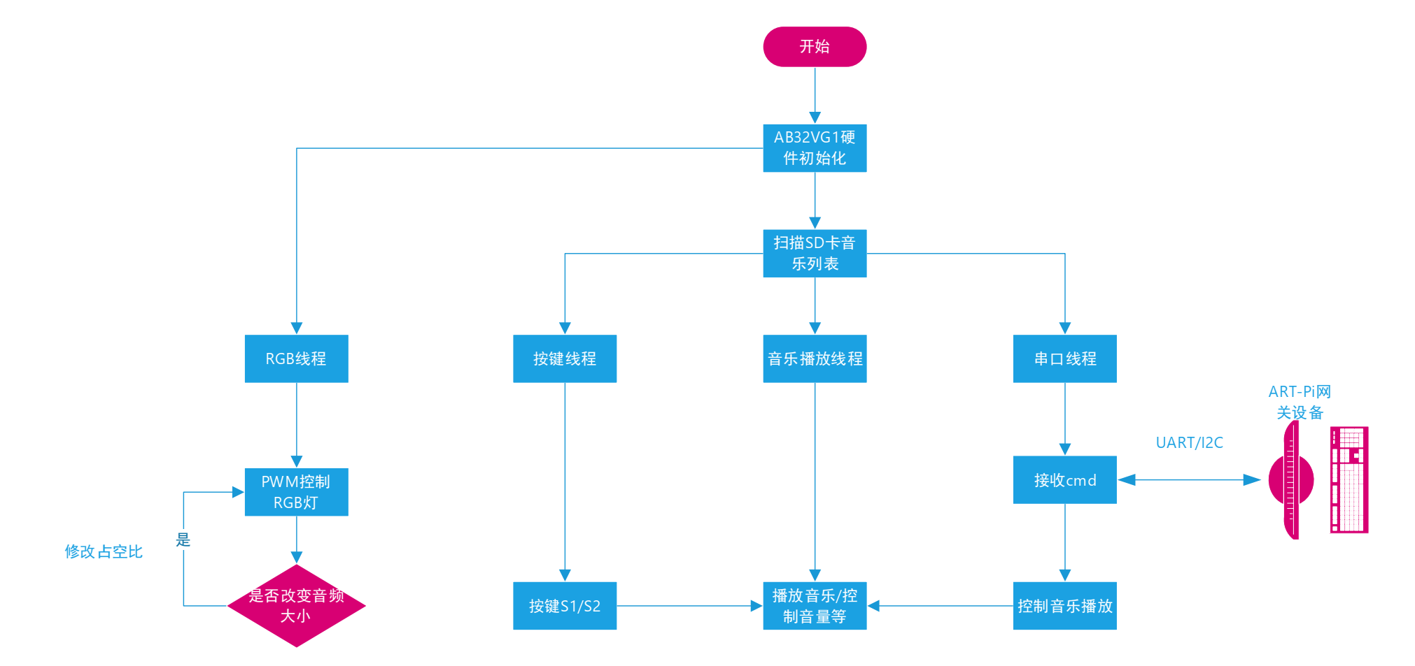 音乐播放是本项目的一大功能,主要由AB32VG1开发板实现,板载由SD卡接口,将音乐存入SD卡,板子上电初始化完成后,即可通过语音、网络控制音乐的播放,当然,也可使用板载的按键控制,同时根据音乐的大小通过PWM控制RGB灯,可以说,非常炫酷。音乐播放提供开始、停止、暂停、恢复播放、上/下一首、增加/减小音量服务,同时还可自动扫描SD卡的歌曲,可循环播放音乐,提供多种控制方式,非常方便。