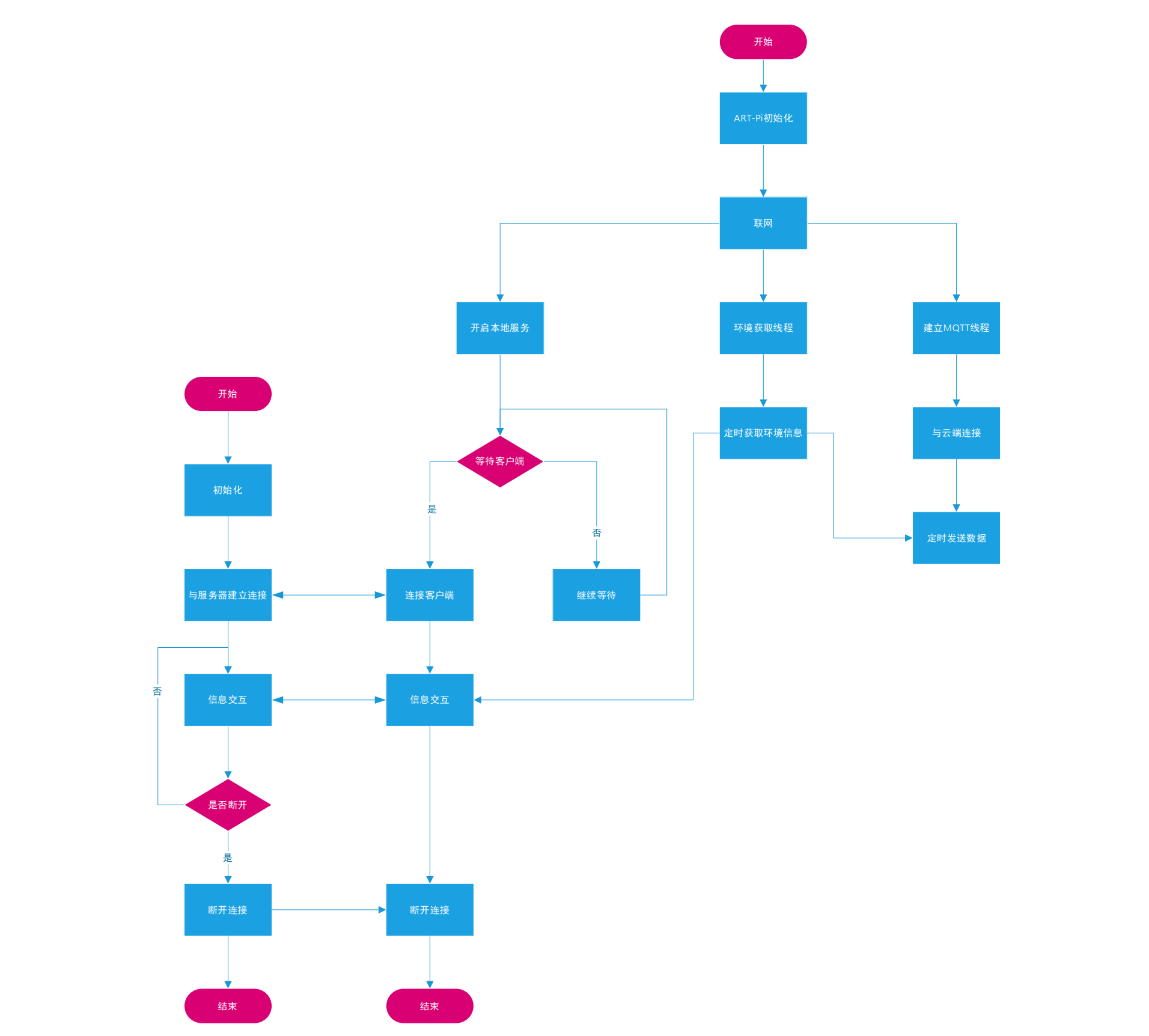 ART-Pi智能网关上电之后完成板级初始化,接着初始化传感器,就会定时采集环境信息,在连接网络和云端后,就会定时向云端发送数据。同时建立本地服务,当有客户端接入网络,也会定时向客户端发送环境信息。