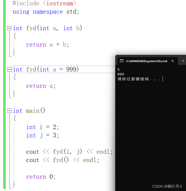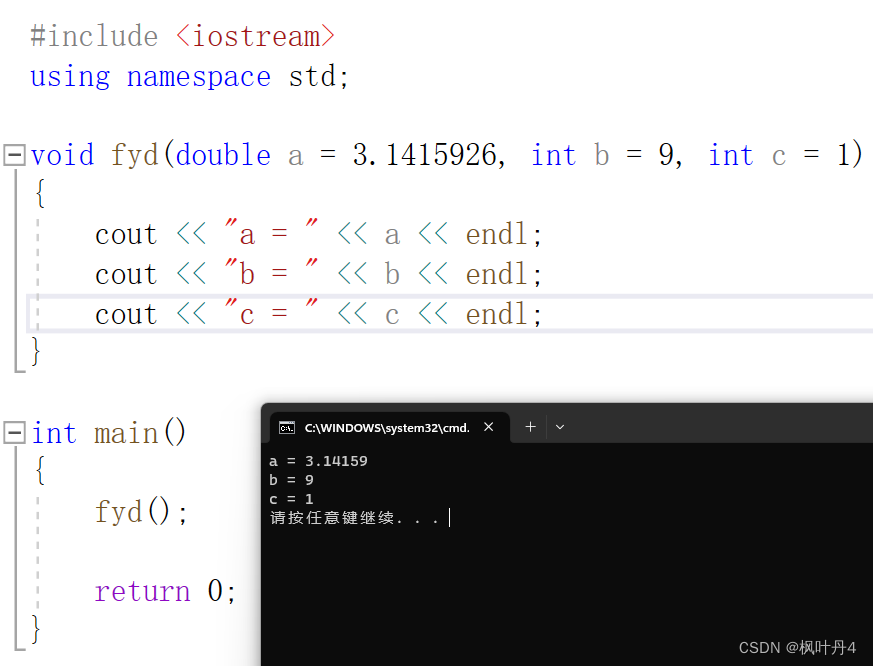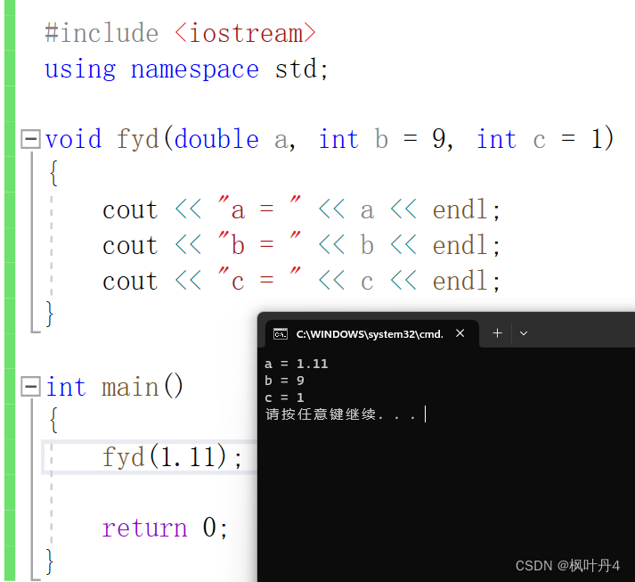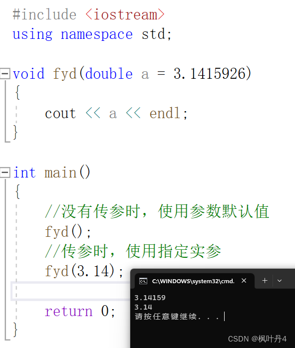 缺省参数是声明或定义函数时为函数的参数指定一个缺省值。在调用该函数时,如果没有指定实参则采用该形参的缺省值,否则使用指定的实参。