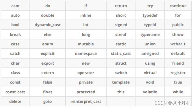 C++(C++98)总计63个关键字,而C语言是32个关键字。下面让我们看一下都有哪些关键字。