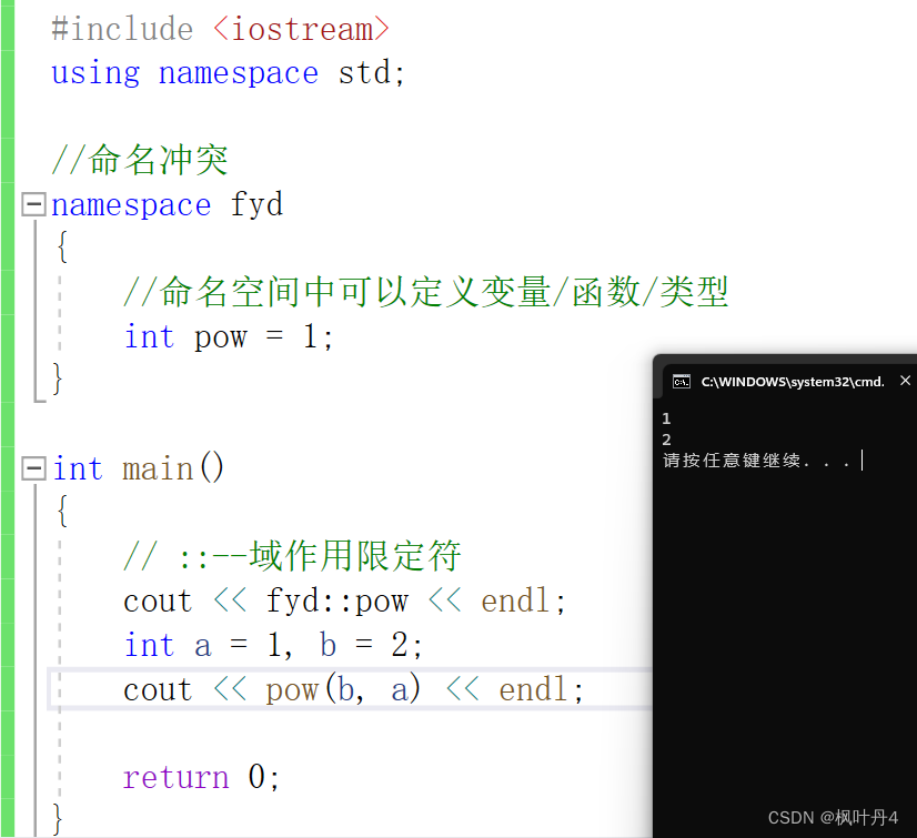 在C/C++中,变量、函数和类等都是大量存在的,而这些变量、函数和类的名称都将存在于全局作用域中,可能会导致很多冲突。使用命名空间的目的是对标识符的名称进行本地化,以避免命名冲突或名字污染,namespace关键字的出现就是针对这种问题的。