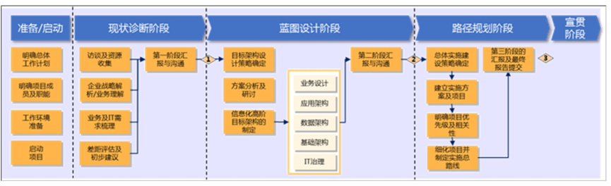 设计出数字化转型的蓝图框架,蓝图设计包括战略愿景、业务架构、数据架构、应用架构、技术架构、IT治理等内容。