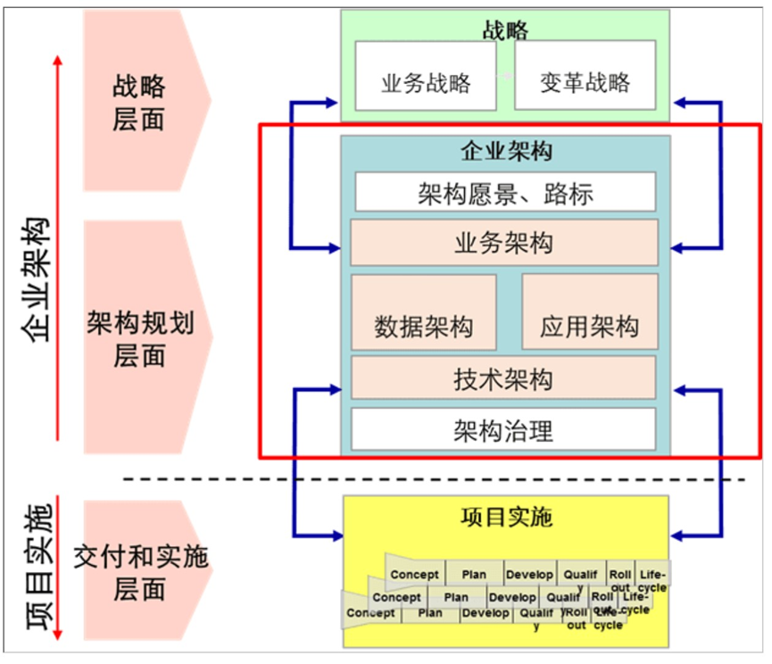 顶层设计的基本方法是通过企业架构(EA)的构建,将发展战略和举措通过流程、IT落地。企业架构围绕企业业务目标,在“战略”和“项目实施”之间架起连接的桥梁,是公司战略执行的基础。