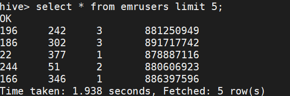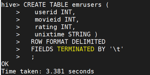 CREATE TABLE emrusers ( userid INT, movieid INT, rating INT, unixtime STRING ) ROW FORMAT DELIMITED FIELDS TERMINATED BY '\t' ;