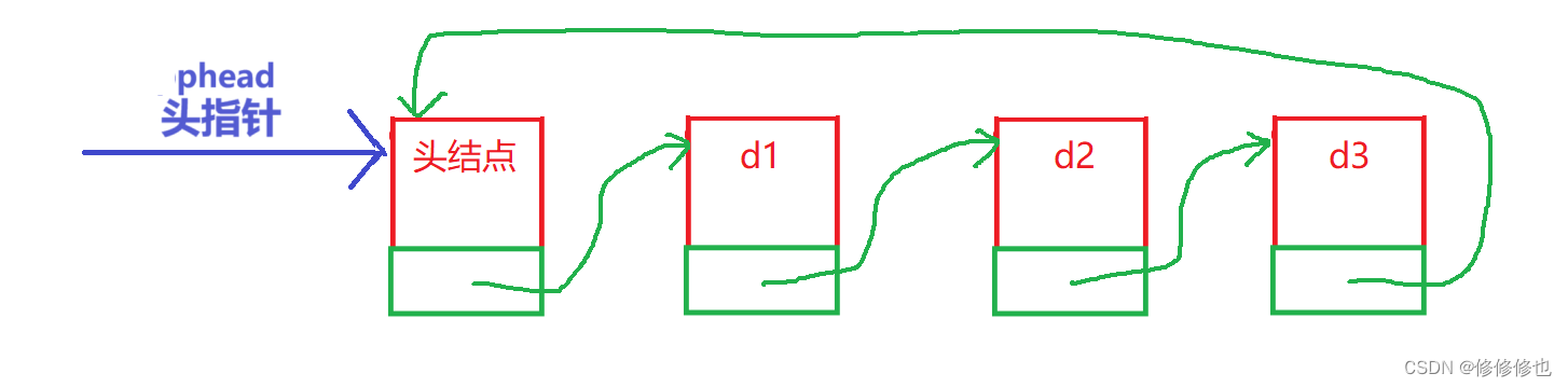 • 有头结点循环单向链表