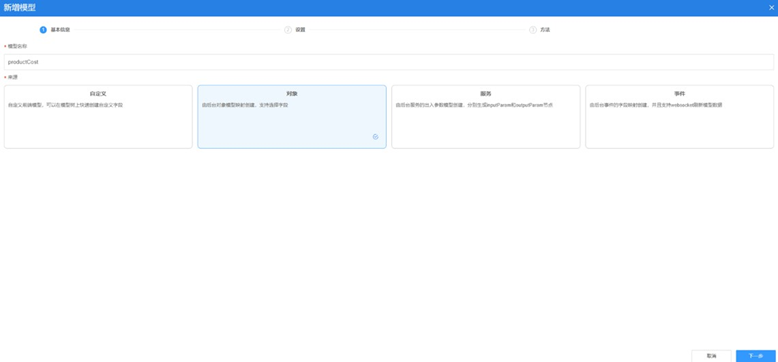 (2)单击“新增模型”,输入模型名称、“来源”选择“对象”,单击“下一步”。