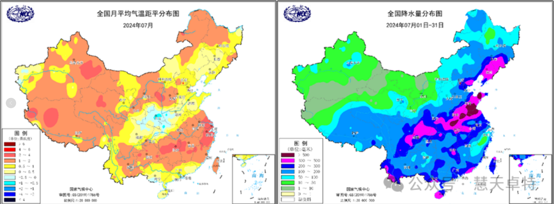 图1 国家气候中心全国月平均气温(左)和降水(右)分布图(2024年7月)