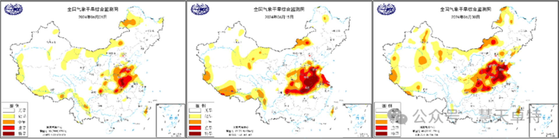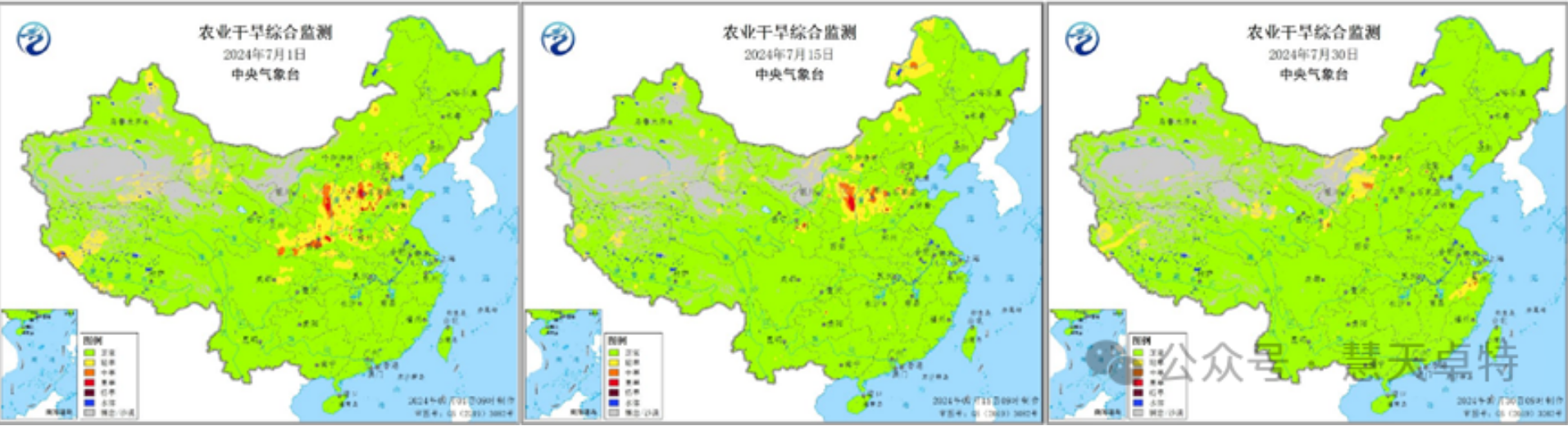 图2为国家气候中心发布的2024年7月月初、月中和月底的全国气象干旱综合监测图,图3为中央气象台发布的2024年7月月初、月中和月底的全国农业干旱综合监测图。(摘自国家气候中心和中央气象台官网)