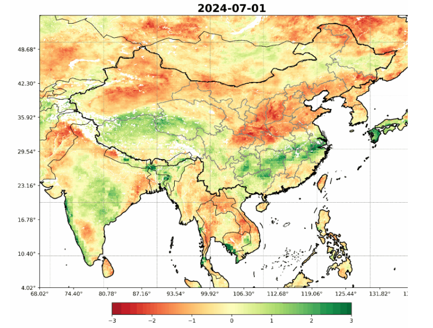 图7为2024年7月全球月平均气温和降水距平分布图(摘自国家气候中心官网),从图中可以看出,本月亚洲大部分国家的平均气温略高于历年同期或持平,降水量明显多于历年同期,图8为我公司的2024年7月月初、月中和月底的亚洲干旱监测图,图9为我公司产品的亚洲6月和7月月平均干旱监测对比情况,图10为我公司产品的亚洲7月份动态干旱监测图。从图中可以看出,本月南亚、东南亚以及东亚日本、韩国的旱情,相比上个月有了明显的好转,但受高温少雨影响,蒙古国的旱情愈发严重。本月南亚、东南亚以及东亚日本、韩国的旱情,相比上个月有了明显的好转,但受高温少雨影响,我国北方的东亚近邻蒙古国的旱情愈发严重。本月初,受持续高温少雨的影响,东南亚的大部分国家、巴基斯坦、印度北部、东亚的朝鲜、韩国等地仍处于持续的严重干旱中,随后出现的降雨有效缓解了以上各个国家的旱情,但到了本月末,降雨减少高温持续,使得东南亚、巴基斯坦、印度北部、斯里兰卡以及东亚的日本和韩国的旱情日益严重。