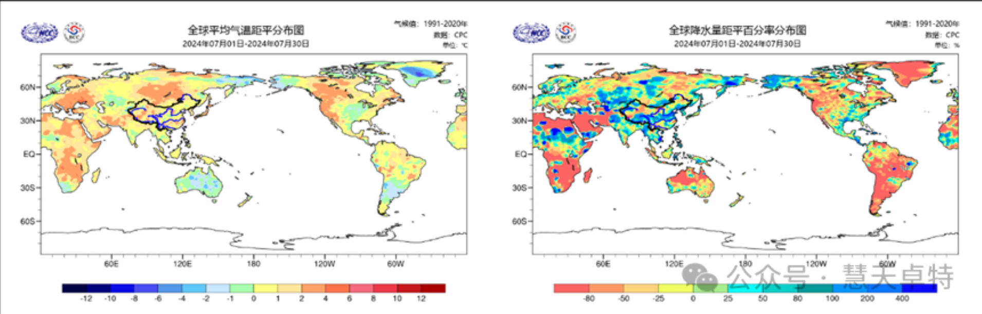 图7 全球月平均气温(左)和降水分布图(右)(2024年7月)