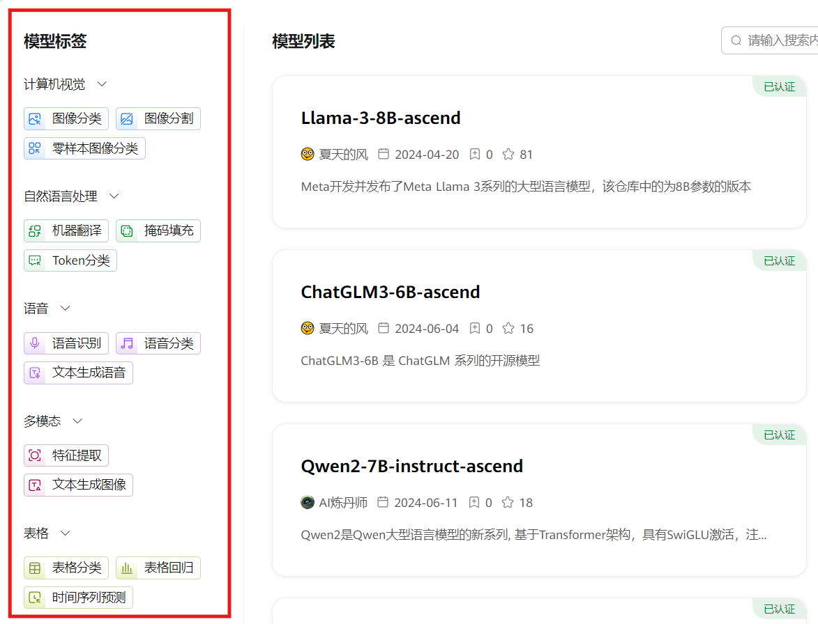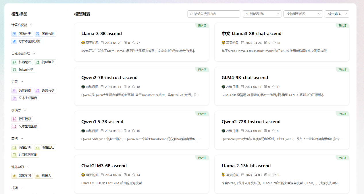 常规的对话大模型之外,AI Gallery还提供计算机视觉、深度学习方面的模型,开发者可以根据左边的标签分类,选择自己需要的。