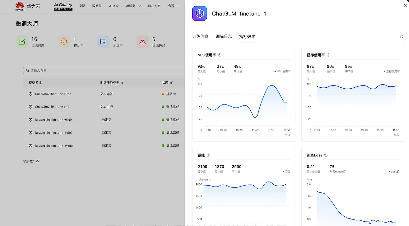模型微调训练完成后即可生成开发者的专属大模型,开发者可以查看相关的训练指标效果,比如资源使用率,训练Loss曲线等。