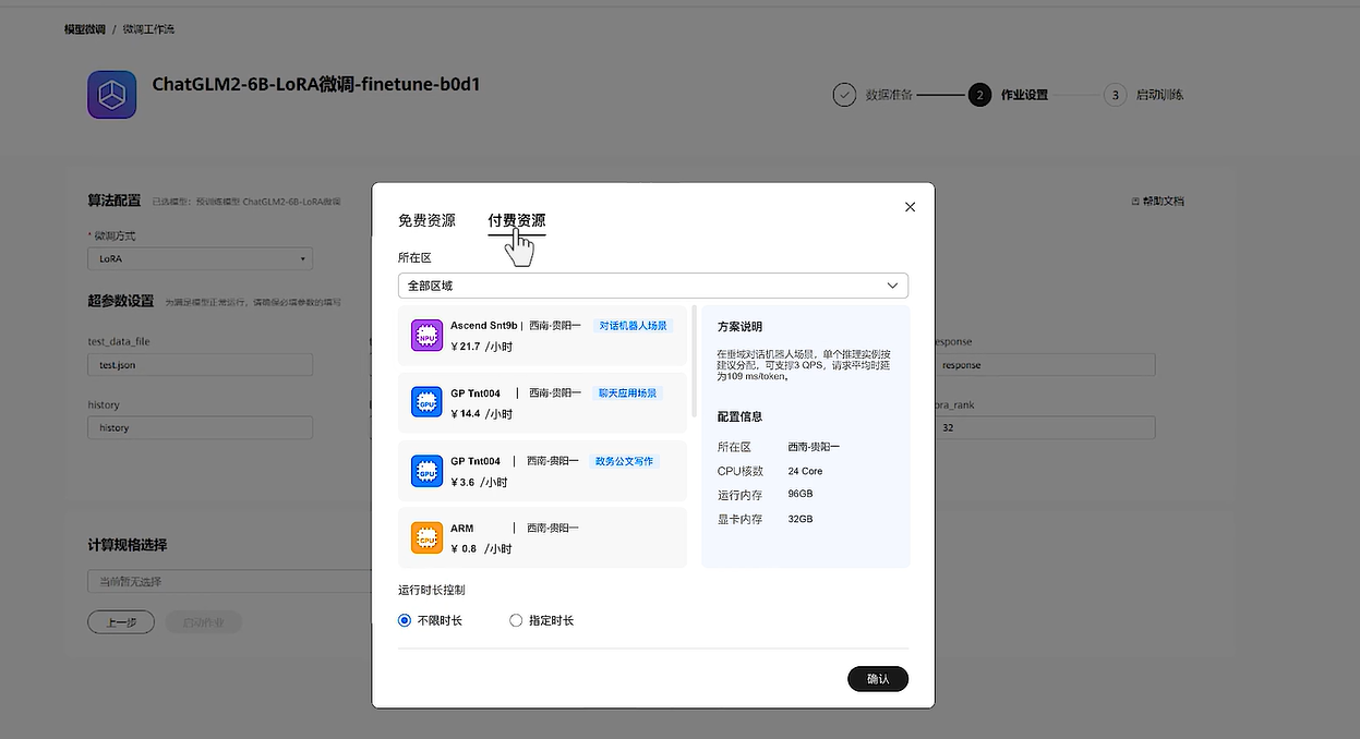 然后选择适合该大模型训练的计算规格,当前通过大量开发者实践,针对主流昇腾云开源大模型,AI Gallery沉淀了最佳的算力组合方案。开发者可以直接选择推荐的规格,确认配置信息,并正式启动训练任务。