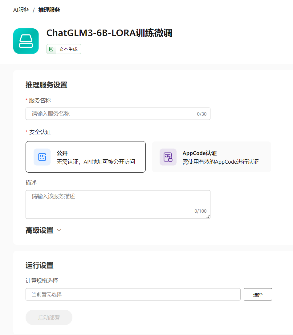 微调训练成功后,我们着手模型的部署。开发者可以进入生成的大模型详情页,选择“部署 > 推理服务”进入部署推理服务页面: