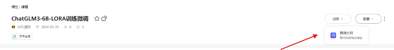 在模型详情页,选择“训练 > 微调大师”进入微调工作流页面。