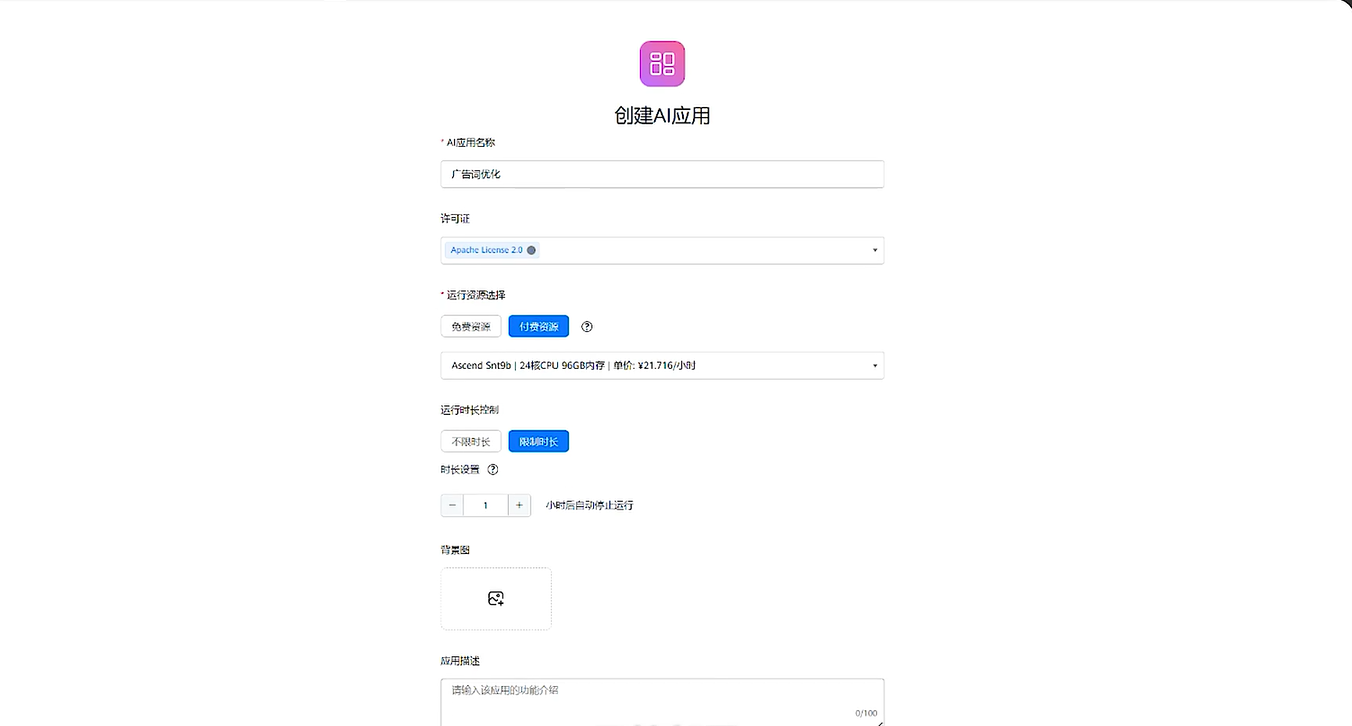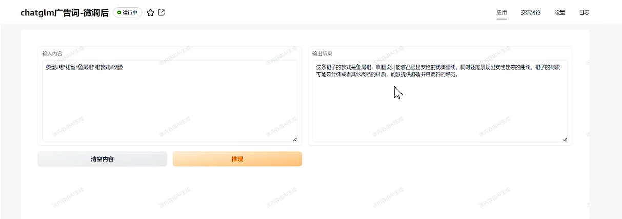 在模型详情页选择“部署 > AI应用”进入页面,开始AI应用创建设置,如名称、规格等等,完成基本信息设置后,即可进入到可视化页面。直接输入你的需求,比如为产品收腰的鱼尾裙写一段广告词,启动推理,便可在右侧获得模型推理的结果。