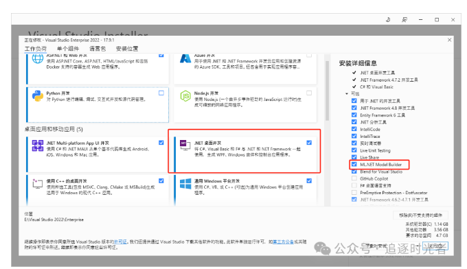 选择.NET 桌面开发工作负荷以及可选的 ML.NET Model Builder 组件。