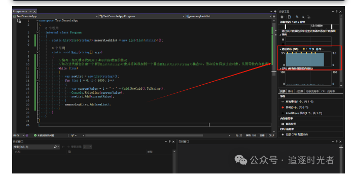 //每次迭代都会创建一个新的List<string>对象并将其添加到一个静态的List<List<string>>集合中,但却没有释放这些对象,从而导致内存泄漏