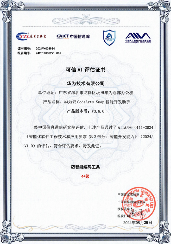 首批通过!华为云CodeArts Snap智能开发助手通过可信AI智能编码工具评估,获当前最高等级