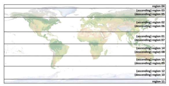 ICESat-2天文台利用光计数激光雷达(ATLAS仪器)和辅助系统(GPS、明星相机、和地面处理)来测量量子从ATLAS往返地球所需的时间,并确定反射的量子的大地纬度和经度。ATLAS的激光脉冲照射表面上的三对左/右光点,这些光点描绘出六条约14 m宽的地面轨迹作为ICESat-2绕地球运行。每个地面轨迹都根据产生它的激光光点编号进行编号,地面轨道1 L(GT 1 L)在最左侧,地面轨道3R(GT 3R)在最右侧。每对内的左/右光点在跨轨方向上相距约90 m,在沿轨方向上相距约2.5公里。更高级别的ATLAS/ICESat-2数据产品(ATL 03及以上)由地面轨道组织,地面轨道1 L和1 R形成对一,地面轨道2L和2 R形成对二,地面轨道3L和3R形成对三。每对还有一对轨道-左右梁实际位置之间的假想线(见图2)。成对轨道在跨轨道方向上相距约3公里。
