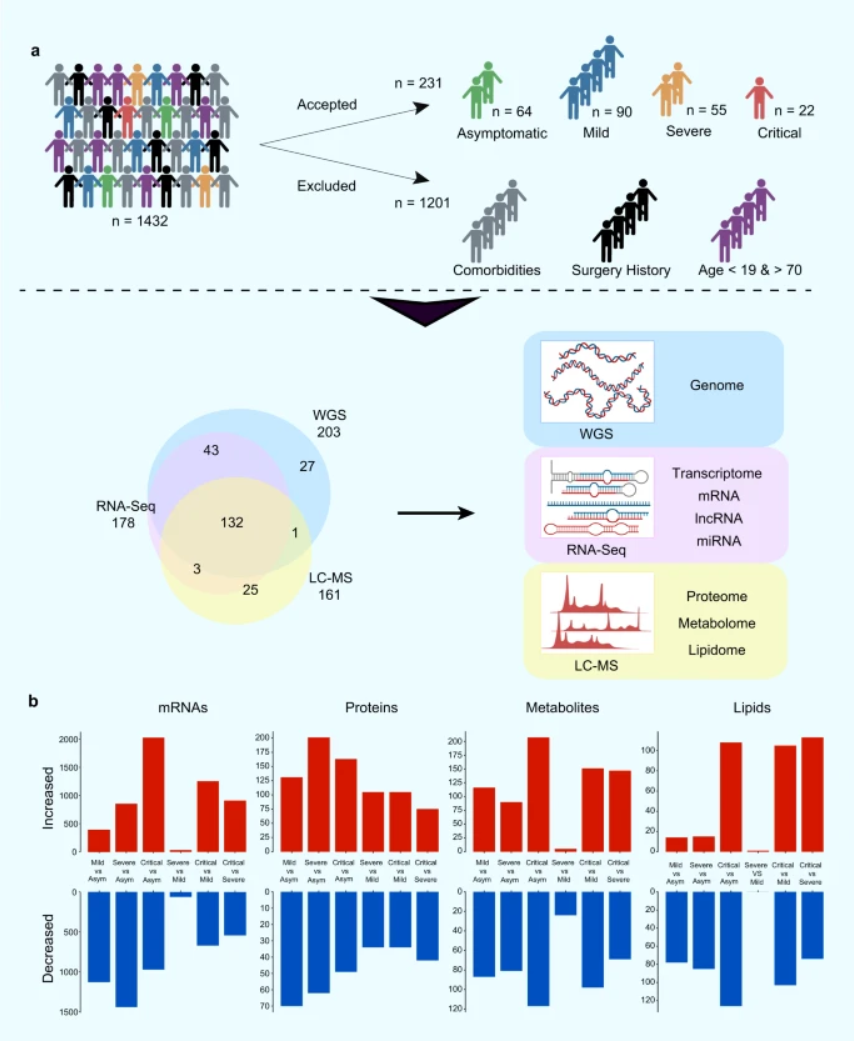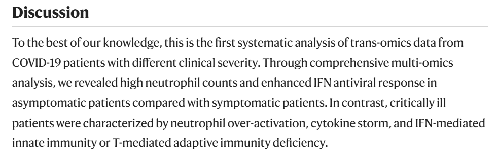 综上所述,该研究展示了从无症状到危重症的大量 COVID-19 患者中血液样本的跨组学景观,提供了与COVID-19相关的新见解和治疗靶点,以及破译COVID-19及其潜在机制的宝贵线索。