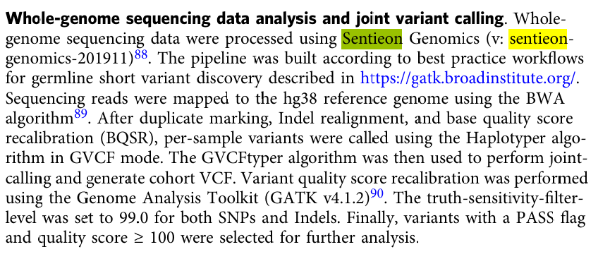 在基因组测序数据分析部分,研究者使用Sentieon软件进行去重复、INDEL重比对、BQSR及单样本突变检测和多样本联合基因分型。