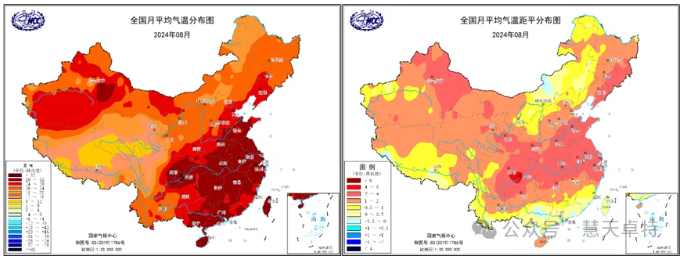 图1 国家气候中心全国月平均气温(左)和气温距平(右)分布图(2024年8月)