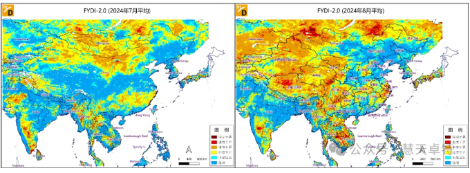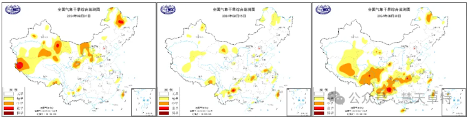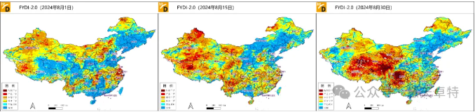 我们基于中国风云卫星观测的遥感数据,通过地表能量物理模型反演出干旱指数,对我国2024年7月份的旱情从时间和空间上也做出了定量的监测和评估。图5为我公司产品的7月月初、月中和月底的干旱监测情况,图6为我公司产品的6月和7月月平均干旱监测对比情况,图7为我公司产品的7月份动态干旱监测图。