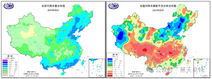 图2 国家气候中心全国月降水量(左)和降水量距平(右)分布图(2024年8月)