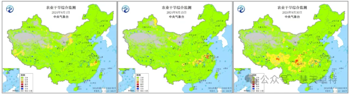 图3为国家气候中心发布的2024年8月月初、月中和月底的全国气象干旱综合监测图,图4为中央气象台发布的2024年8月月初、月中和月底的全国农业干旱综合监测图。(摘自国家气候中心和中央气象台官网)