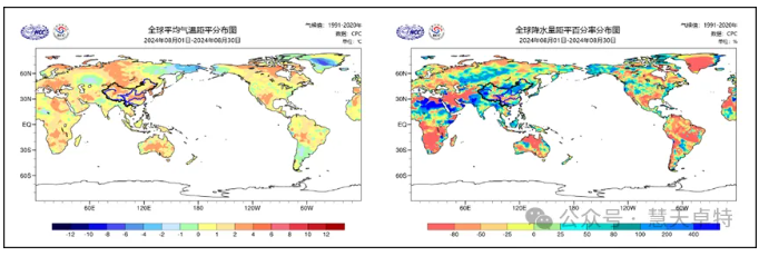 图8 全球月平均气温(左)和降水分布图(右)(2024年8月)