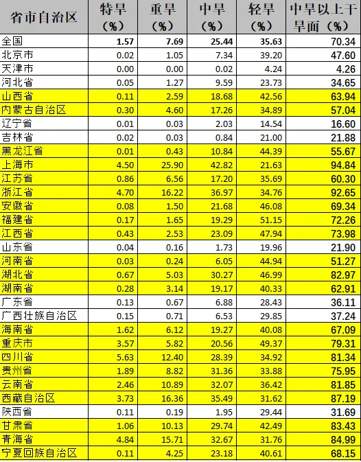 本月我国极端天气频现,北方暴雨频繁,南方高温屡创新高,我国西部大部分地区处于不同程度的干旱中,全国仅有北京、天津、河北、辽宁、吉林、山东、广东、广西、陕西、台湾等省市自治区的干旱稍轻,中等以上干旱面积低于50%(详见下表)。