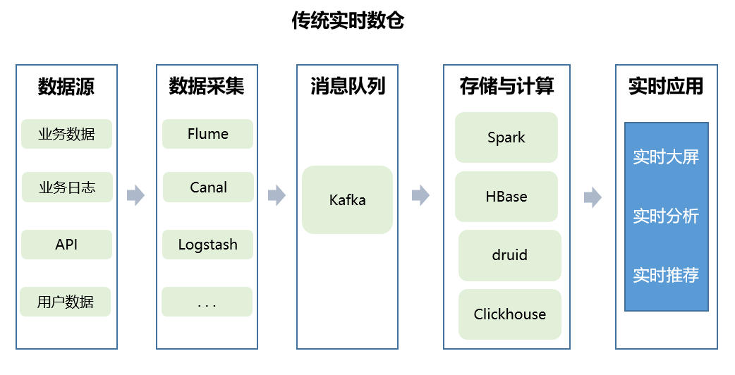 在传统的实时数仓建设中,由于上游数据源的不一致性,企业通常需要采用Flume、Canal、Logstash等不同的数据采集工具,并通过消息队列Kafka将数据写入数据仓库,且在实际业务环境中,通常需要HBase、Druid、Hive、ClickHouse等不同的存储引擎和计算引擎配合来满足业务的实时需求。这一过程涉及众多组件,数据链路较长,维护成本高昂。