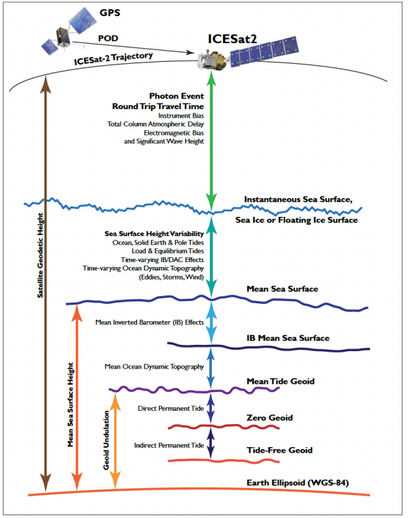 ICESat-2天文台利用光计数激光雷达(ATLAS仪器)和辅助系统(GPS、明星相机、和地面处理)来测量量子从ATLAS往返地球所需的时间,并确定反射的量子的大地纬度和经度。ATLAS的激光脉冲照射表面上的三对左/右光点,这些光点描绘出六条约14 m宽的地面轨迹作为ICESat-2绕地球运行。每条地面轨迹根据产生它的激光光点编号进行编号,地面轨迹1 L(GT 1 L)在最左边,地面轨迹3R(GT 3 R)在最右边。每对内的左/右光点在跨轨道方向上相距约90 m,沿轨道方向相距约2.5公里。ATL 07数据产品按地面轨迹组织,地面轨道1 L和1 R形成对一,地面轨道2L和2 R形成对二,地面轨道3L和3 R形成对三。每对还具有成对轨道--左和右梁实际位置之间的假想线(见图1)。成对轨道在跨轨方向上相距约3公里。