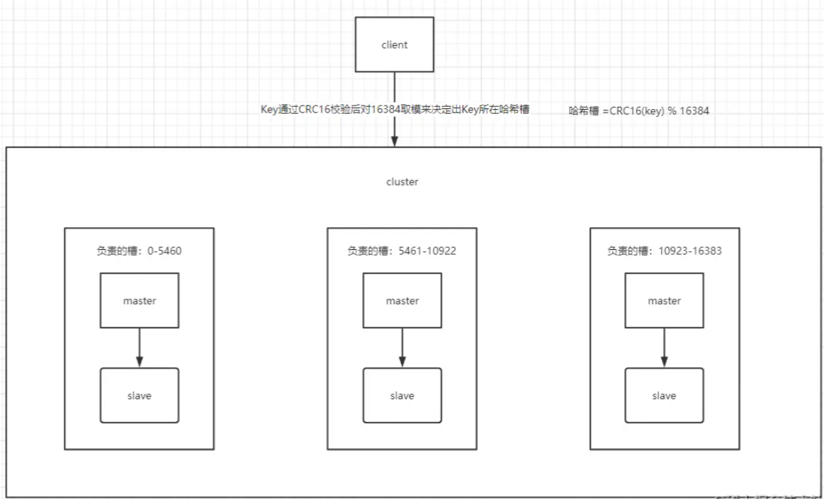集群通过分片的策略,由多个节点管理集群中的16384个哈希槽,查询时先CRC16(key)% 16384计算key所在哈希槽,再去管理该哈希槽的主节点处理