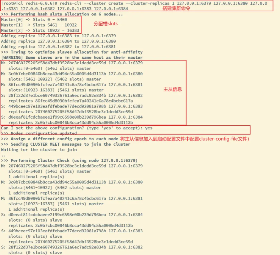 #--cluster-replicas 1 表示每个主节点携带一个从节点