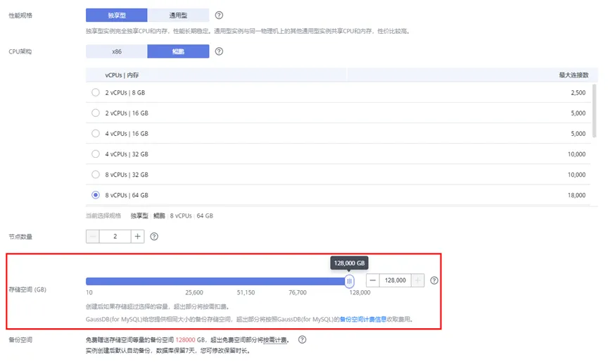 1.在创建GaussDB(for MySQL)实例时,存储空间可自由选择,上限是128TB,操作如下: