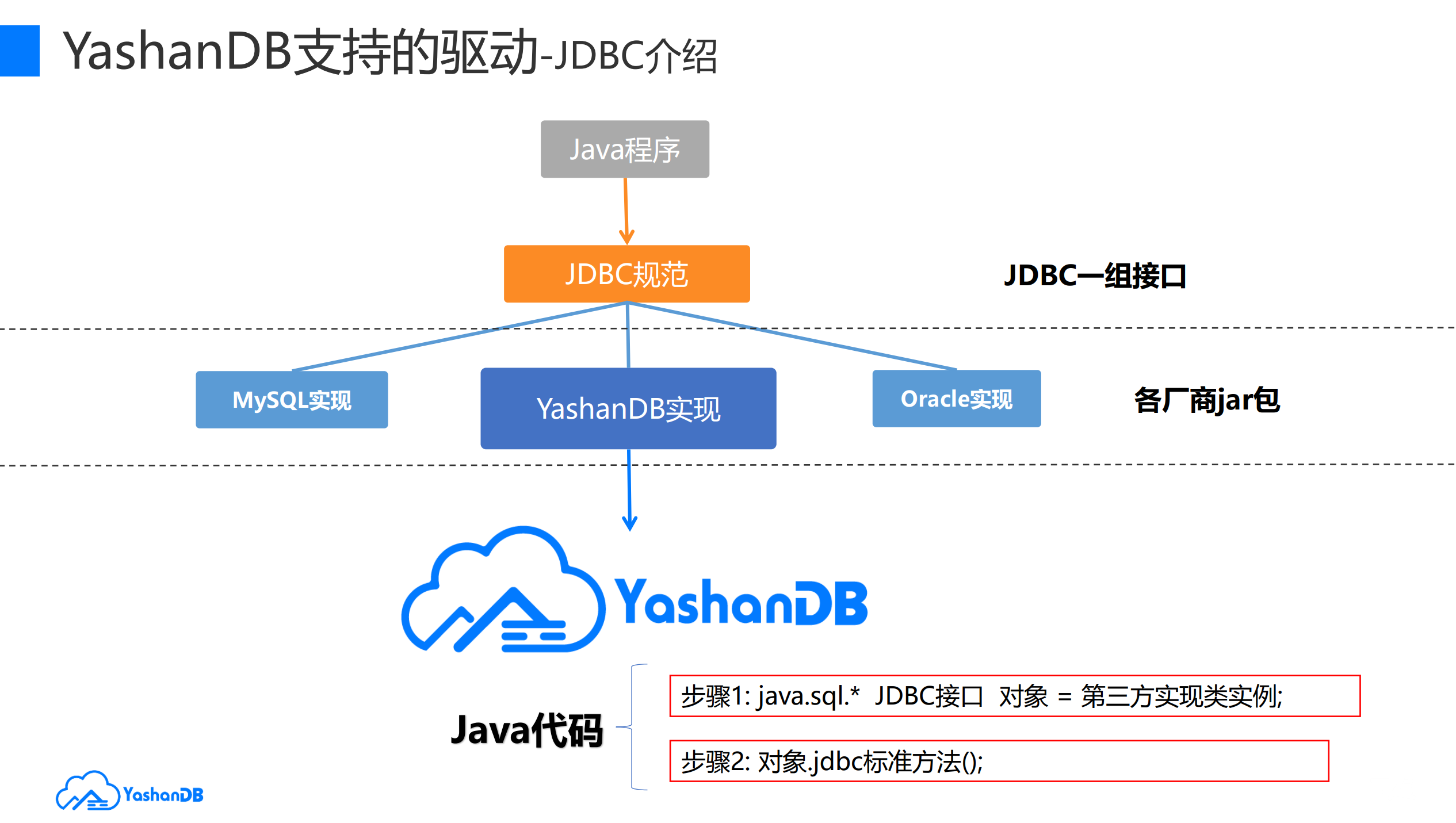 YashanDB支持的JDBC驱动的介绍,它展示了JDBC规范、JDBC一组接口以及不同数据库实现的示例。其中三个主要部分:Java程序、YashanDB和Java代码。Java程序是通过JDBC规范与数据库交互的基础,而YashanDB则提供了对这些规范的支持。可以通过Java接口来访问数据库,并且可以使用Java代码来创建对象并执行SQL查询。有以下两个步骤,第一个是创建一个JDBC接口对象,第二个是使用这个对象执行SQL查询。