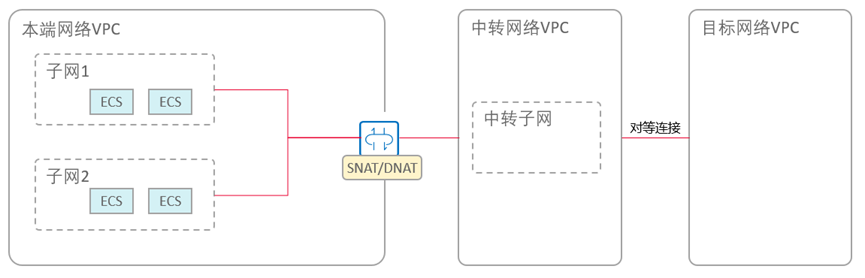 一般在2个VPC存在地址冲突又需要连通的时候,可以通过给SNAT/DNAT引入一个“中转网络”进行“翻译”后连通。