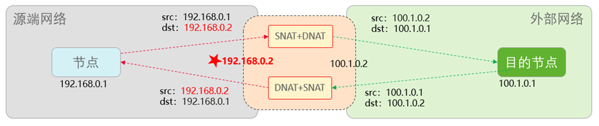 但是Fullnat的时候(即SNAT+DNAT一起用),则不用感知对方的实际IP了,对方已经在你方网络内,放置了一个“代理人”(下图标星处)。你只需要跟“代理人”通话,自然会传递到目的地。