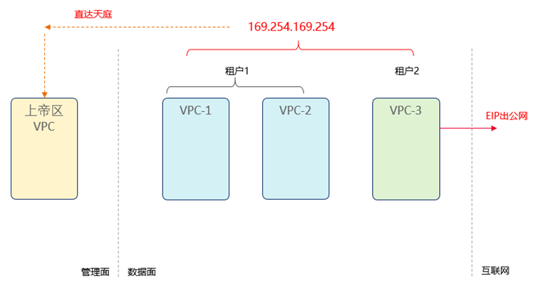 比如:VM里面是不知道自己的“外号”EIP地址的(因为EIP是可以漂移的,是后期动态挂上来的)。然而有的程序,给外部发通告的时候,是需要告知自己的“外部监听地址”的。因此它需要去询问上帝,关于自己的一些“上帝视角”的信息。这就是 169.254.169.254 这个地址的了。