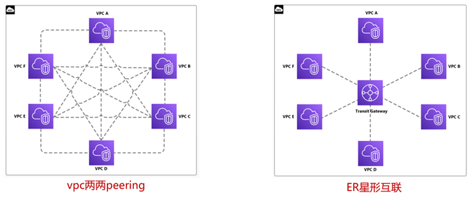 (2)多个VPC需要互联时,使用Peering会很乱,可以使用ER进行“集中”管理。