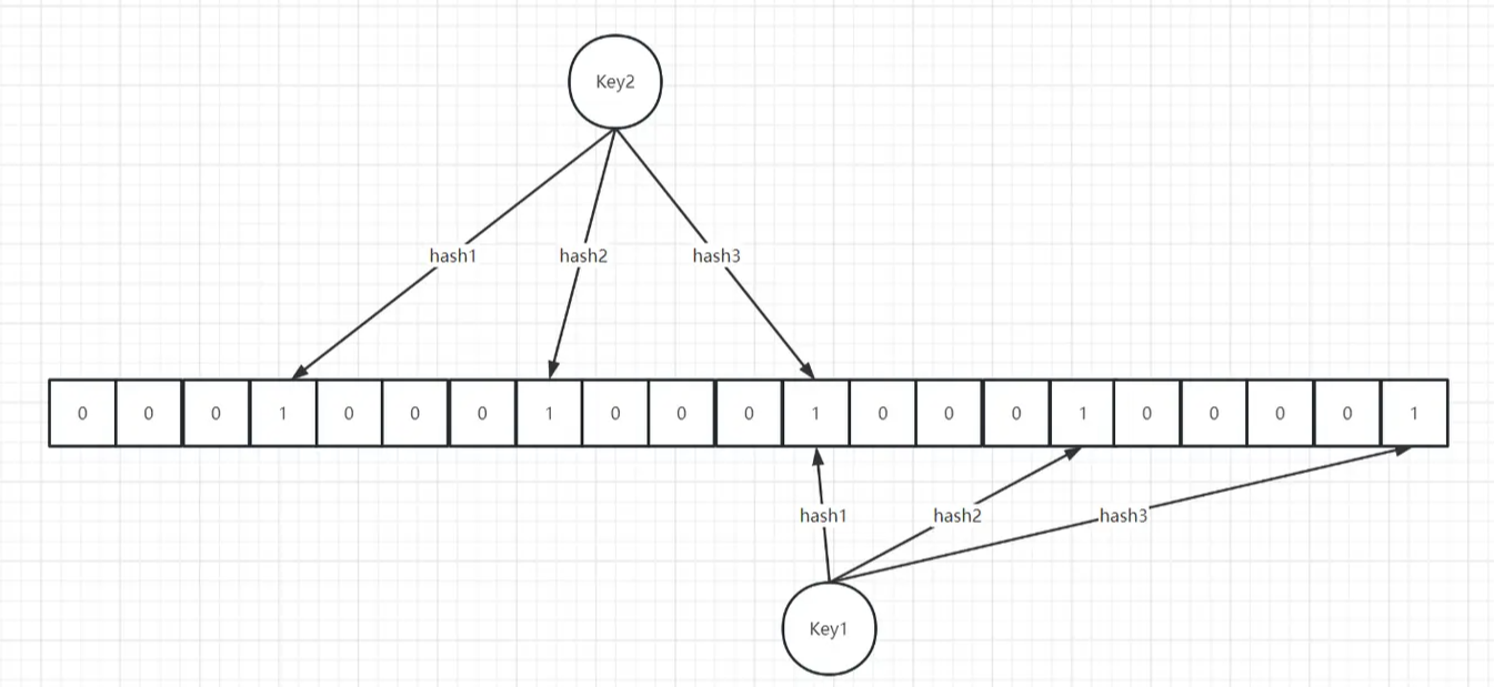 判断是否在集合中:将Key经过多个hash函数得到的索引,查看位数组对应索引上值是否为1,为1则可能存在(该索引上设置为1还有可能是添加其他Key设置的),如果值为0,那么该Key一定不存在集合中