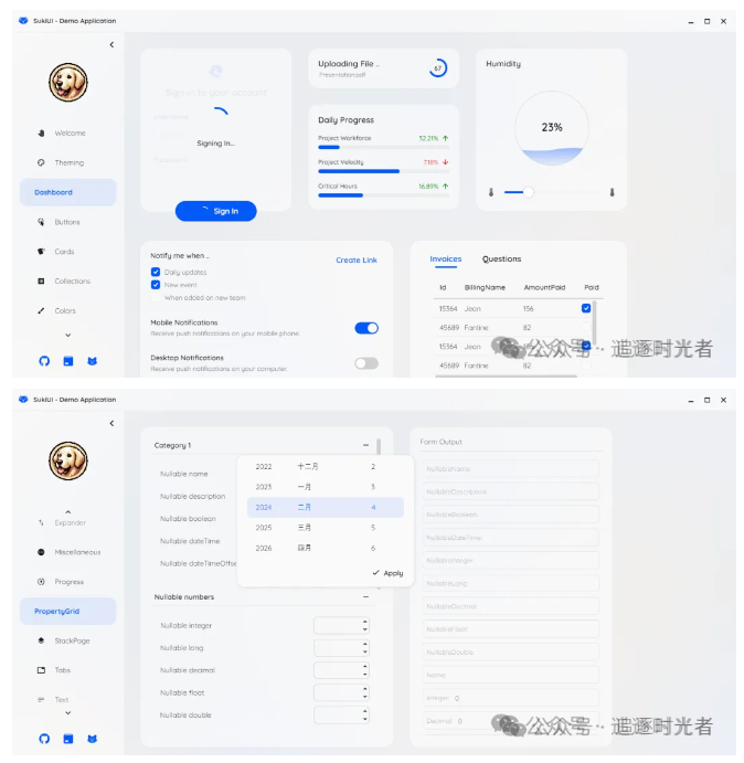 SukiUI 包含 AvaloniaUI 基本控件的主题,支持浅色/深色主题。提供了在不同颜色主题之间选择和切换以及创建自定义主题的能力。并且SukiUI还包含额外的控件,以提供制作丰富多样的用户界面的可能性。