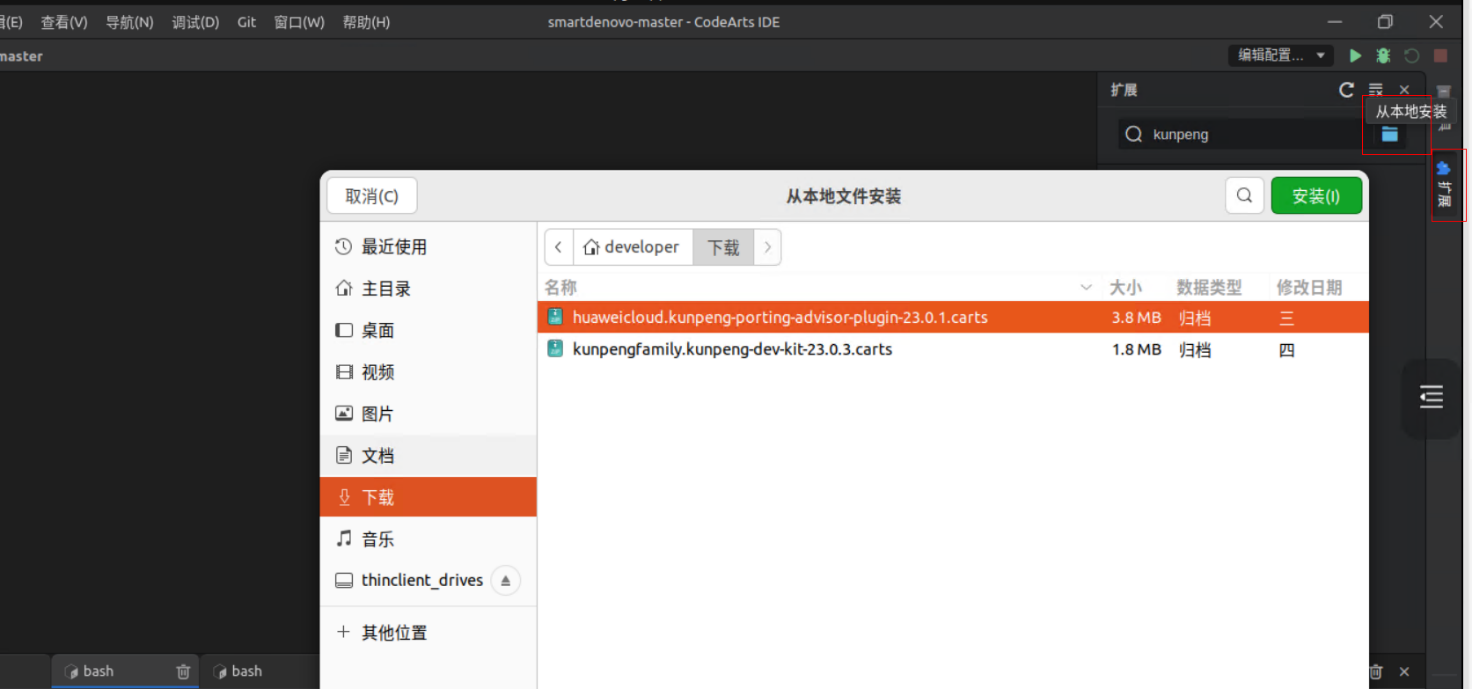 在云主机桌面,打开CodeArts IDE开发环境,单击右侧“扩展”按钮,点击从本地安装,选择下载好的插件安装。