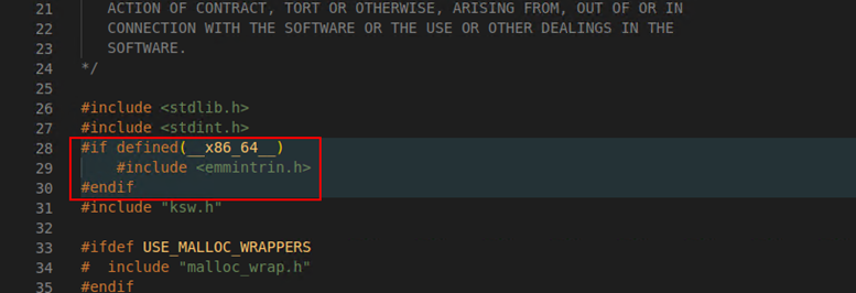 在扫描报告界面,可以在“需要迁移的源文件”下查看需要修改文件,点击“查看建议代码”后可跳转到源码页面,根据修改建议直接修改源码。从迁移报告中可以得知,有Makefile和ksw.c两个文件需要修改。首先点击ksw.c对应的“查看建议代码”按钮,修改ksw.c的源代码