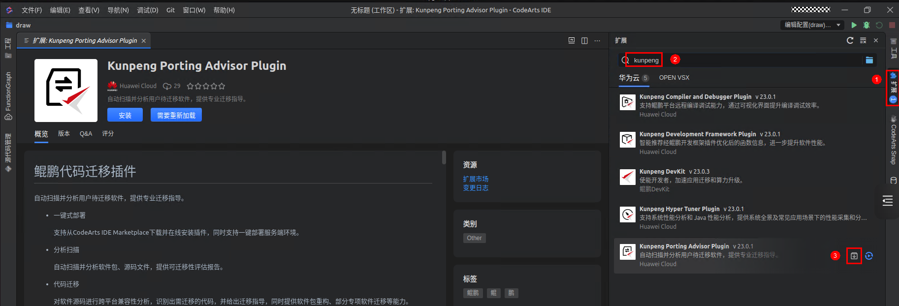 进入云主机 ,打开CodeArts IDE,点击左侧“扩展”搜索“Kunpeng Porting Advisor Plugin”点击安装该插件
